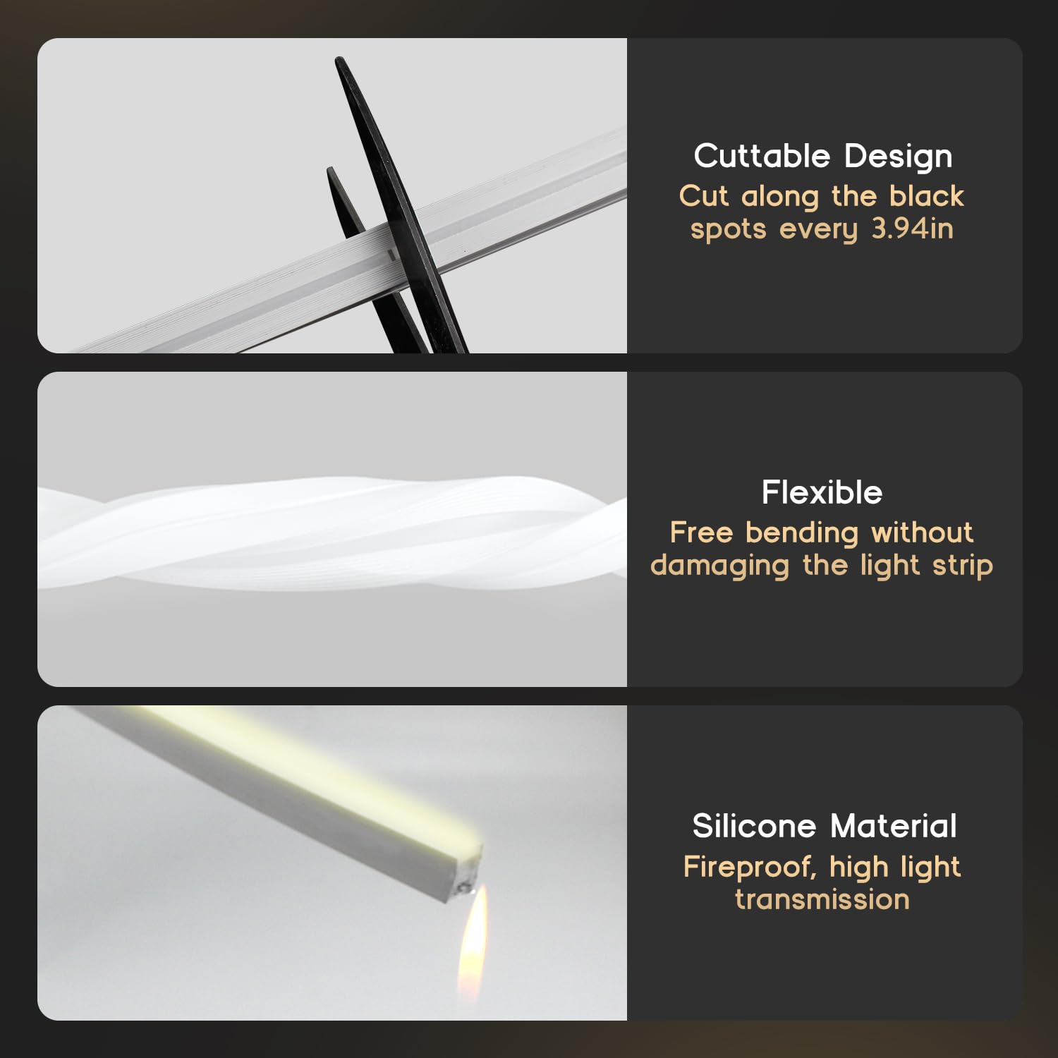 - Perfect Uniform Light:The upgraded LED strip lights has an tube on the outside,which can achieve glow in a line.120° wide range of uniform light emission.There are almost no dark parts.The light emitted is soft and non-glaring.Please note:The strip lights is not dimmable.