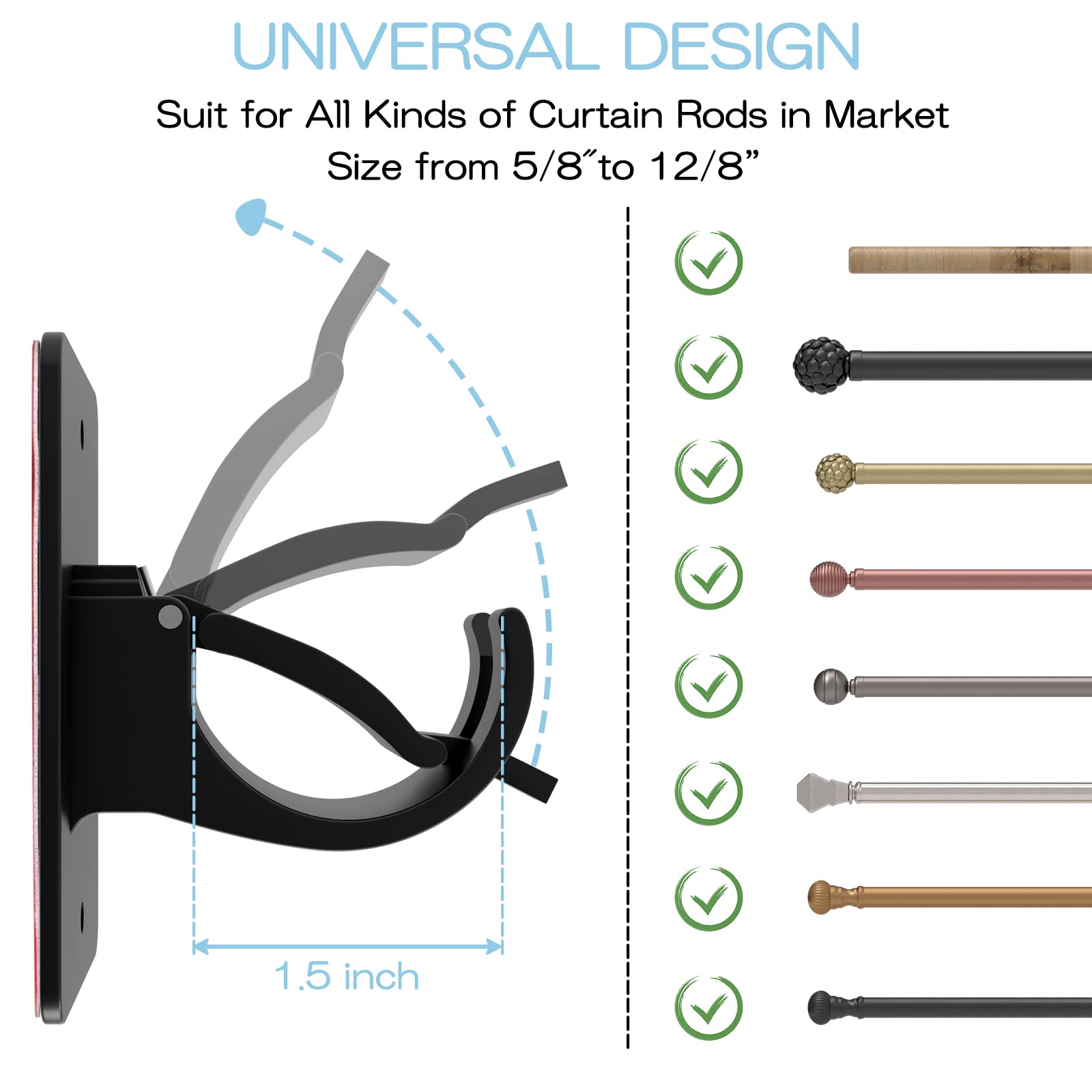 - 4 Pcs Curtain Rod Brackets: You will receive 4 pcs universal plastic self adhesive curtain rod brackets with screw, which measures approx 3 * 1.8 * 2.4 inch. Suitable for curtain rods or towel rods with a diameter of 5/8'' to 12/8''. In addition, you can also hang small accessories such as hats, umbrellas, and towels.