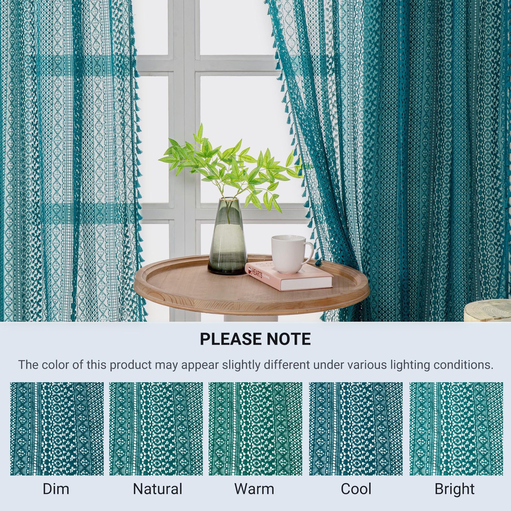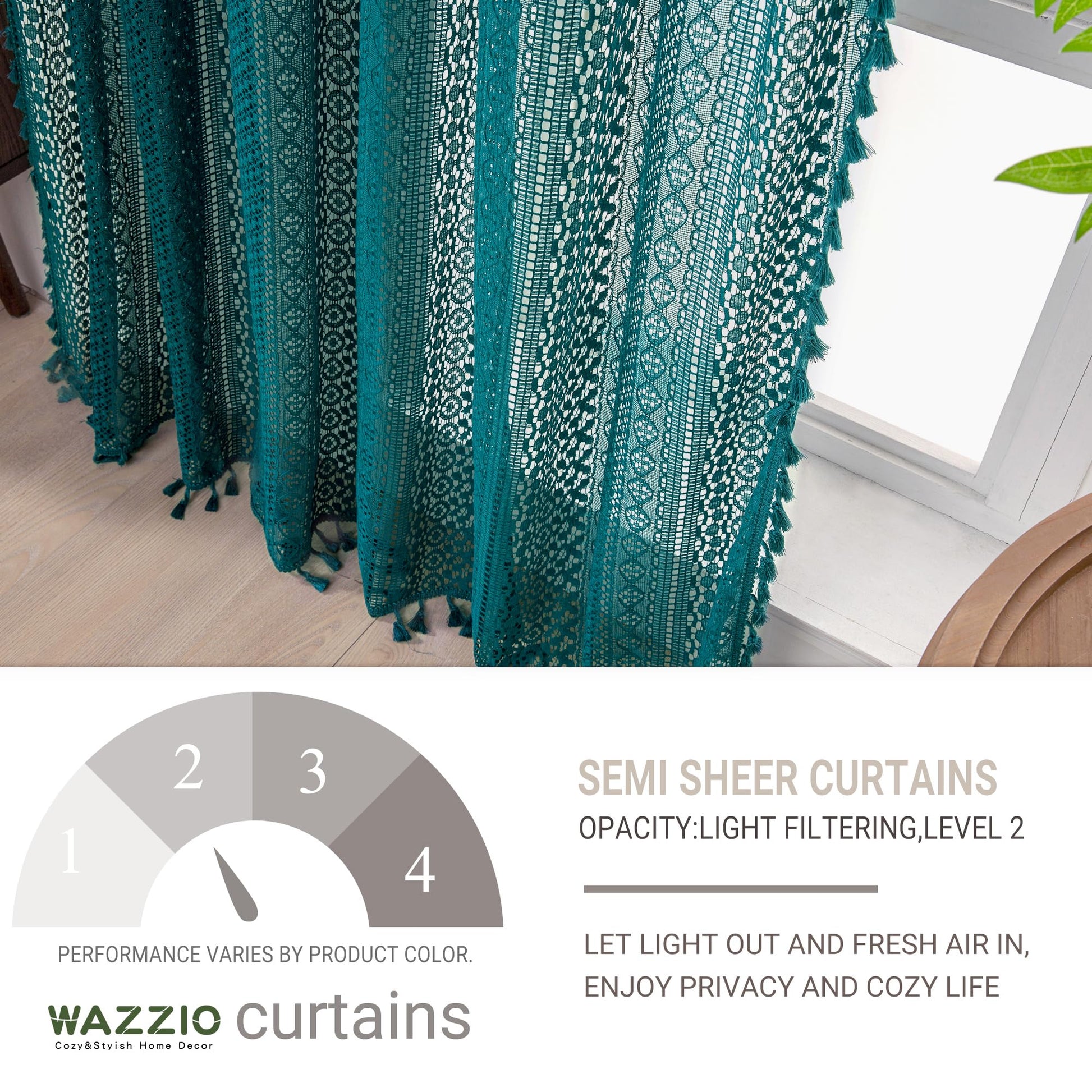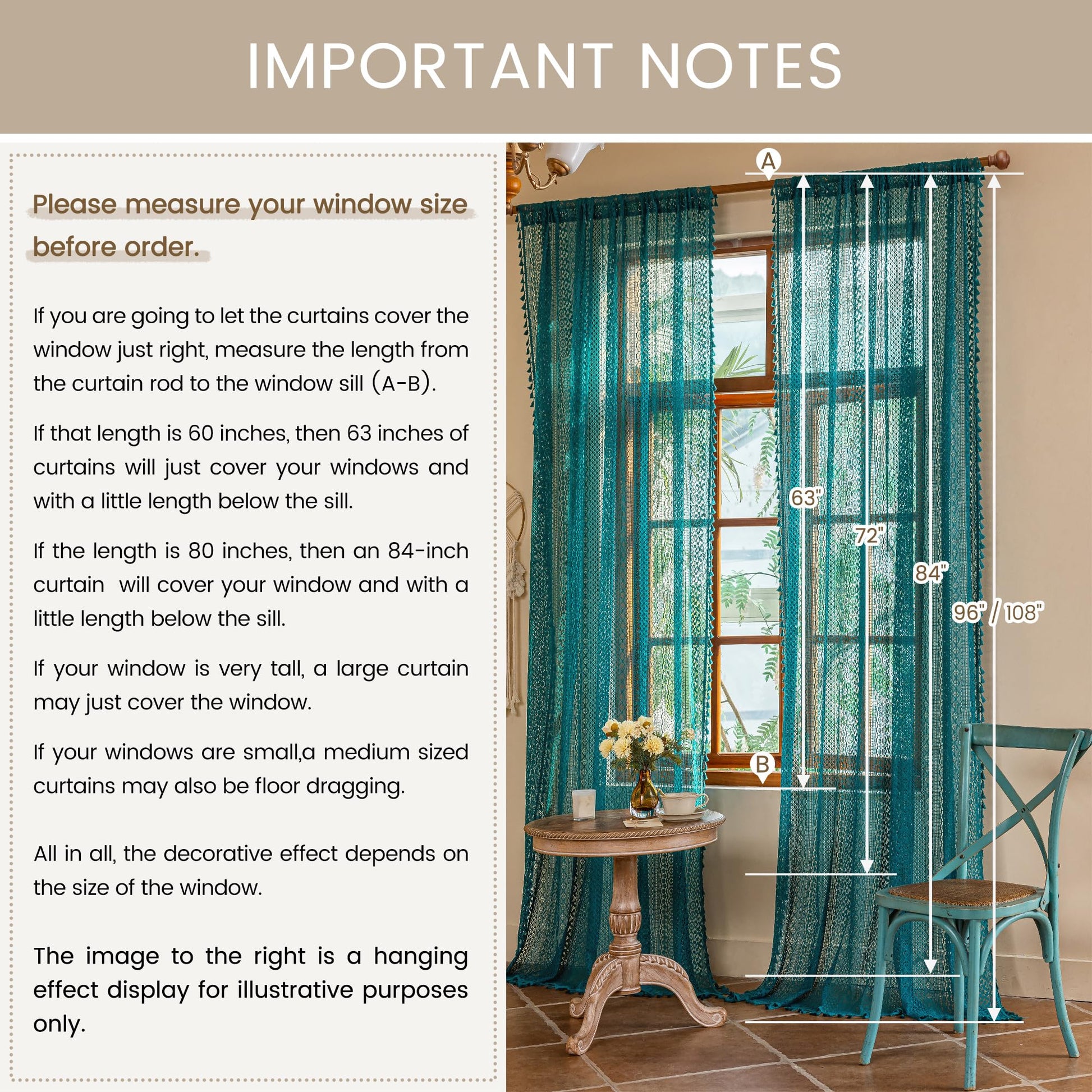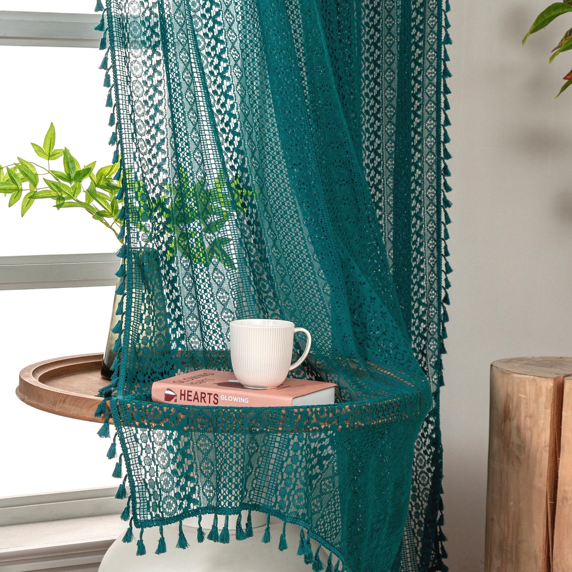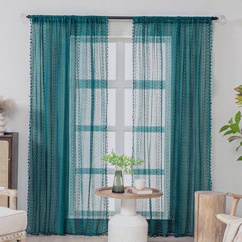 WAZZIO Teal Sheer Curtains 84 Inches Long Boho Cotton Crochet Lace Curtains with Tassel Rod Pocket Semi Sheer Light Filtering Curtain Drapes Teal Curtains for Bedroom Living Room 2 Panel,Turquoise