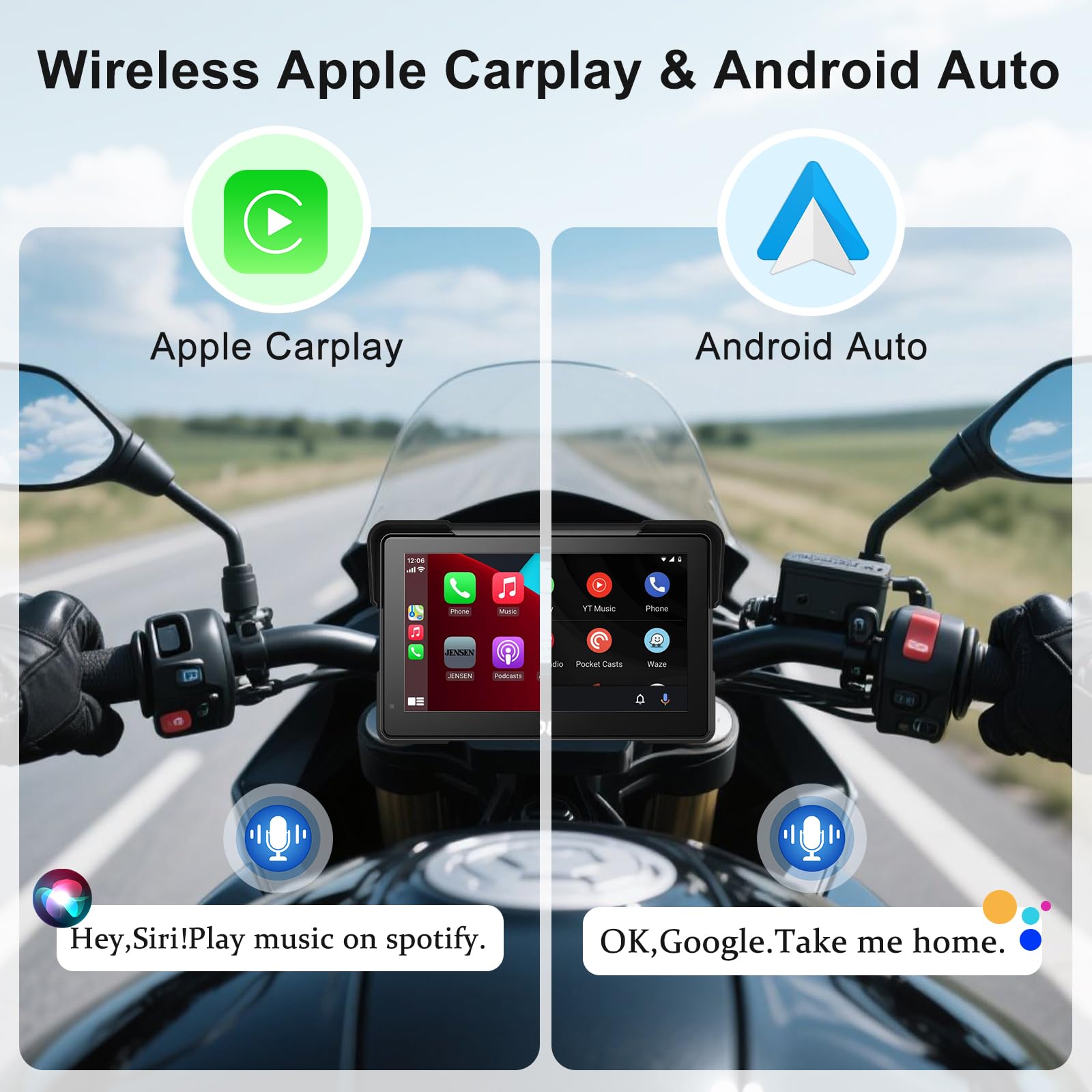 - 🚗【Wireless Apple CarPlay & Android Auto】This Motorcycle GPS Navigation System supports CarPlay and Android Auto. Our Moto carplay connects to smartphones via Bluetooth. Supports Siri and Google Assistant for easy access to map navigation, phone calls, music, messages and more. Helps you focus on road conditions for a safer ride.