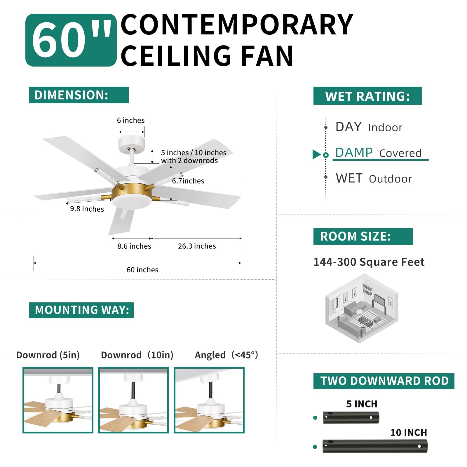 - Easy Installation: The bedroom ceiling fan comes with 5-inch and 10-inch downrods for low and high ceilings. Our patio ceiling fan is delivered with all necessary accessories for a straightforward installation process, making it easy to enhance your room's comfort and style quickly