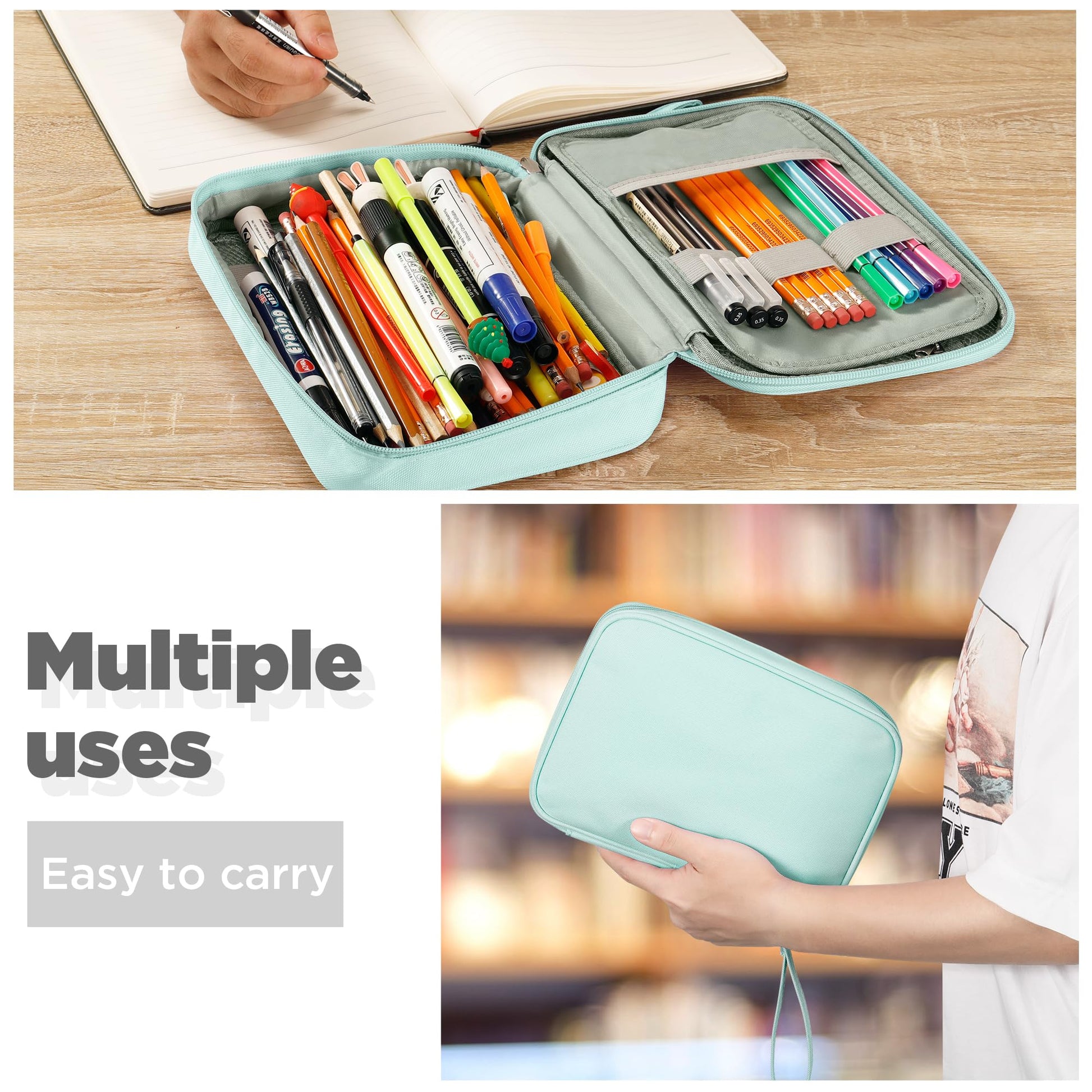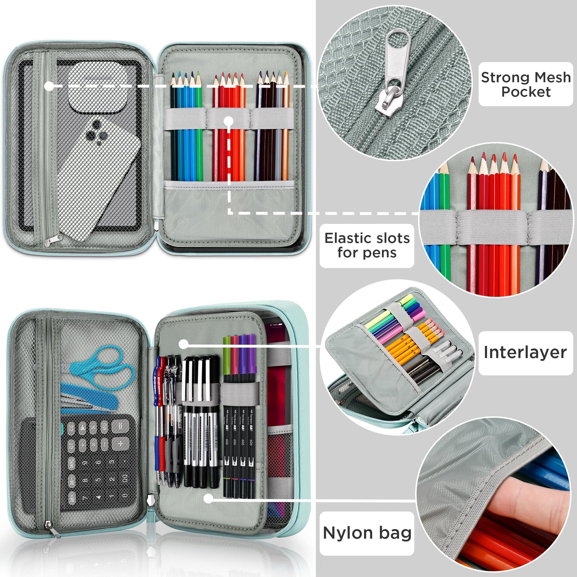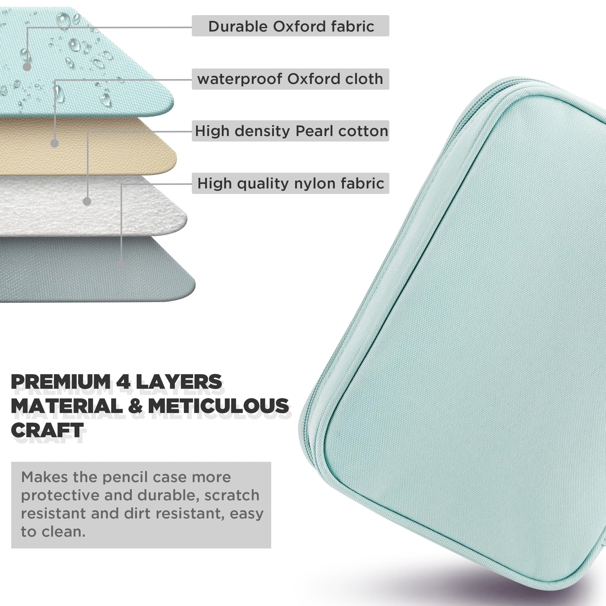 - Sandwich Cover Design & Shape Support, Quadruple Protection - 3-layer design on cover: The outer layer is premium oxford cloth with water-resistant inner coating, protects your pencil or pen from sudden water splash.The middle layer with thick foam board, prevents your stationery from shocking. The inside lining with is high density polyester, avoids tearing up in daily use. Extra built-in shape support system, keeps this pencil case in good shape, cushions it from bumps and crashes.