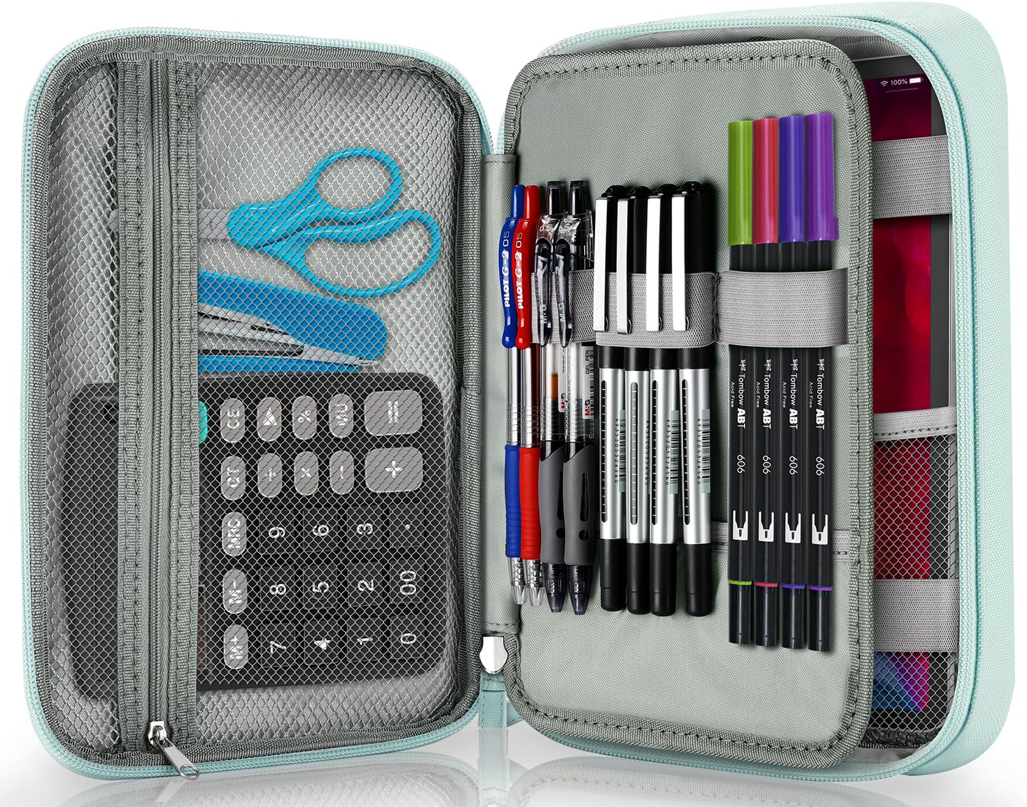 - Upgraded Large Capacity, Ideal For Various Occasions - 9.2 x 7.0 x 1.5 inch internal dimension, easily fits 100 pieces standard size pens and pencils. Perfect for most size of pencils, includes Tombow dual brush pens, ball pen,wax pencil,Highlighter,water color pen,marker pen, etc. Flexible design of mesh bags, make it also fit for bullet journal, 6 x 8 inch sketchbook, iPad mini, 6 inch Kindle. A must have for writing journal, drawing sketch, creating prototype and taking notes.